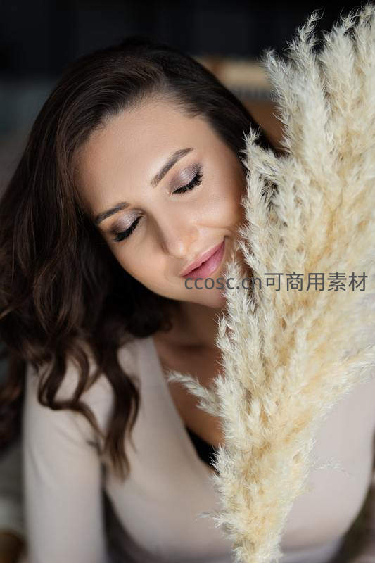 一位长发女子轻闭双眸,面带浅笑,身旁蓬松的蒲苇增添自然气息,营造出宁静温柔的氛围。