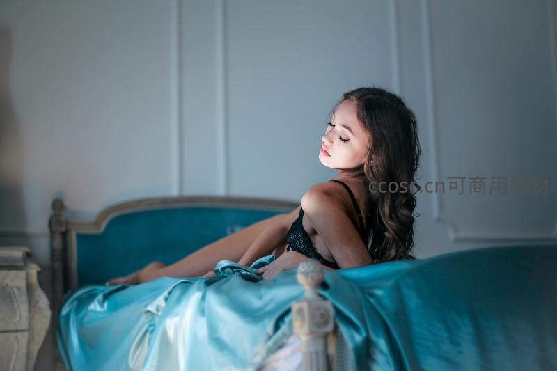 女子身穿黑色内衣,倚靠在蓝色丝质床单上,柔和光线勾勒轮廓,展现慵懒而优雅的私密时刻。