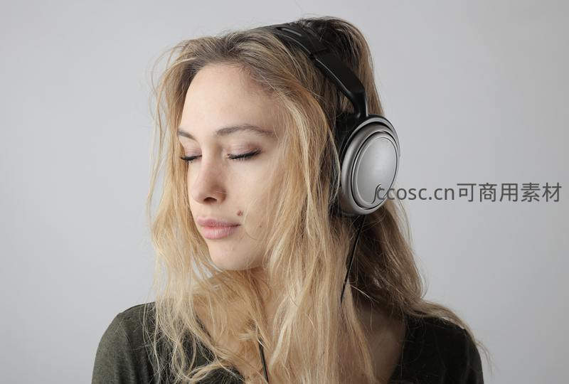 金发女子戴耳机沉浸音乐世界