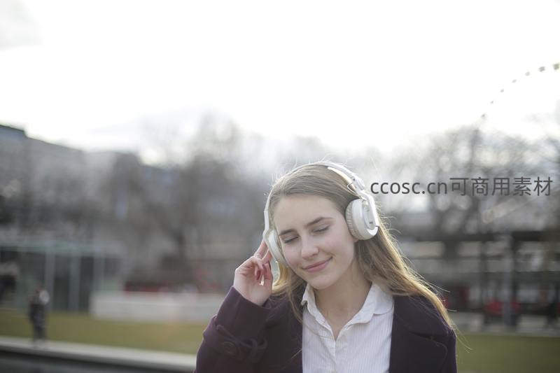 一位金发少女戴着白色头戴式耳机,在户外阳光下闭眼微笑,享受音乐带来的愉悦,背景是模糊的城市公园景致,充满青春活力与惬意。