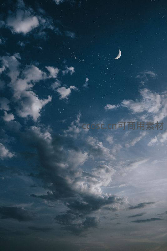 深蓝色的夜空中繁星点点,一弯新月优雅地悬挂其间,蓬松的云朵如薄纱般漂浮,构成一幅宁静梦幻的天穹图景。