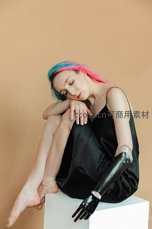 蓝粉双色长发女子身着黑色吊带裙,蜷腿坐于白色立方体上,机械手臂自然垂放,闭目安详,背景纯色突出主体,兼具科技与柔美气质。