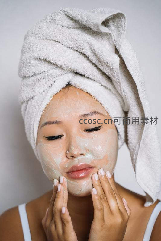 女子闭目享受全脸涂抹白色保湿面膜的过程,头裹毛巾,双手轻抚脸颊,营造宁静舒适的居家美容疗愈时刻。