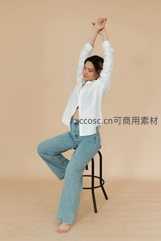 女子身着白衬衫与牛仔裤,赤脚坐在黑色高脚凳上,双臂向上伸展,姿态优雅,展现日常居家伸展运动带来的身心舒缓。
