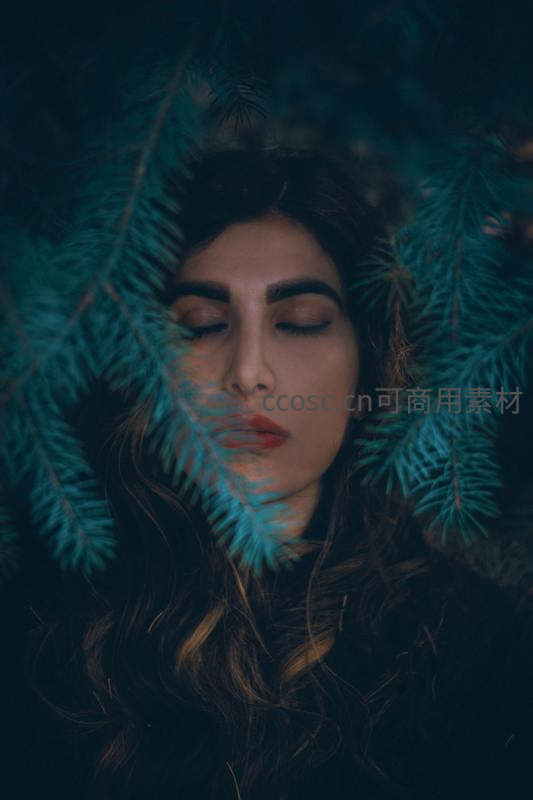 女子面庞隐于深色松枝之间,冷蓝色调的松针如帘幕般垂落,光影交错间营造出神秘而诗意的氛围,仿佛置身梦境森林深处。