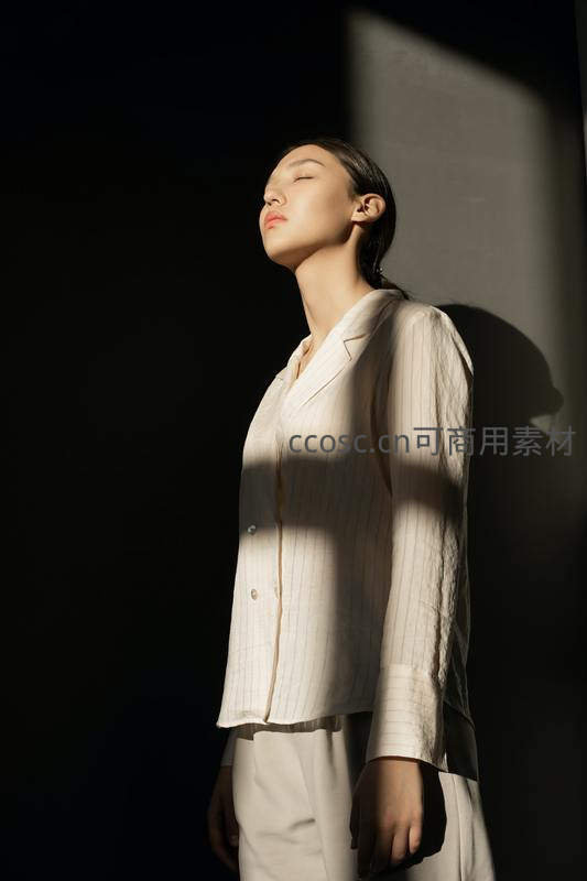 身穿条纹白西装的女子侧身站立,阳光穿过窗户在她身上投下斑驳光影,闭目享受宁静时刻,展现出优雅与内敛的现代气质。