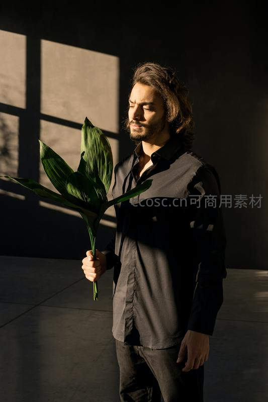 一位长发男子在明暗交错的室内环境中,手持一束绿叶,神情宁静,阳光透过窗户洒下斑驳光影,营造出深邃而富有诗意的氛围。