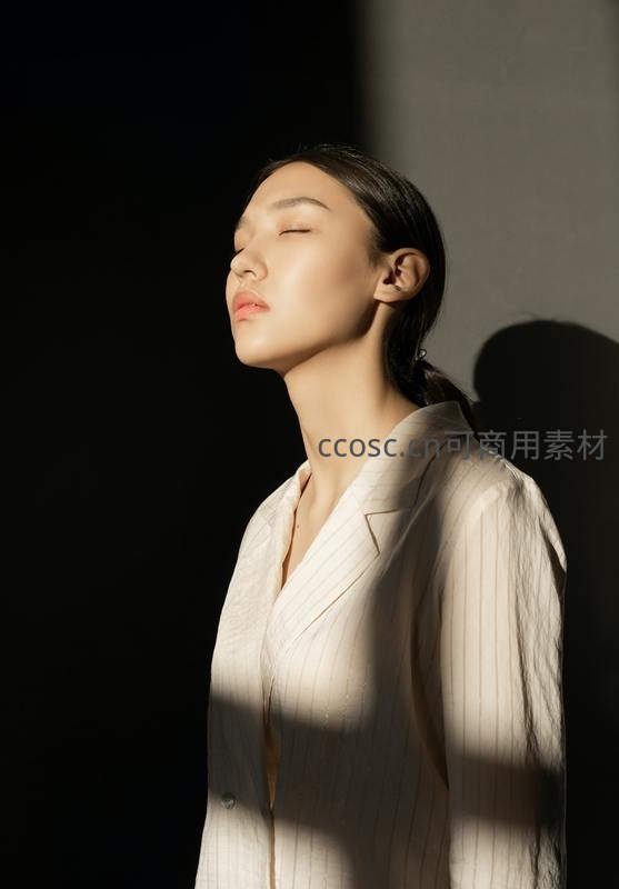 女子身穿浅色条纹西装,闭目仰首,侧脸被一束斜射阳光温柔照亮,深色背景衬托出她的轮廓与神态,整体画面极简而富有张力,传递出内省与平和之美。