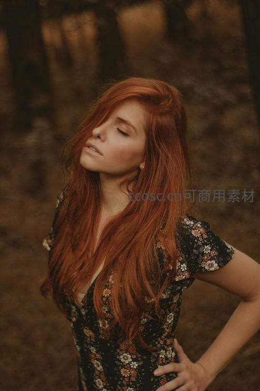 一位长发红发女子置身林间,闭目仰头,仿佛在感受自然气息,画面宁静又充满诗意。