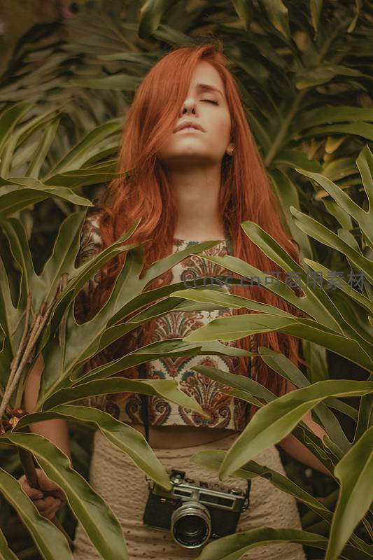 红发女孩怀抱老式相机,被热带植物包围,眼神迷离,营造出探索自然与时光交错的意境。