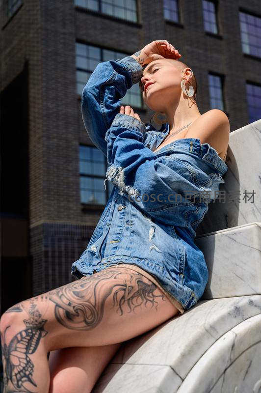 一位拥有大面积腿部纹身的女青年坐在城市建筑旁的大理石台阶上,身穿破洞牛仔外套,享受午后阳光,展现个性与都市生活气息。
