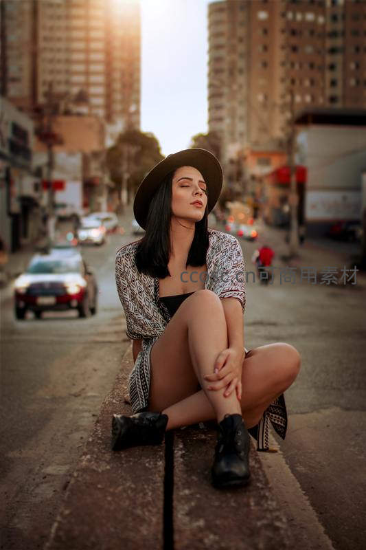 一位戴着宽檐帽的年轻女子坐在城市街道中央,背景是林立的高楼和车流,夕阳的暖光勾勒出她宁静的轮廓,展现出都市生活的片刻安宁与时尚感。