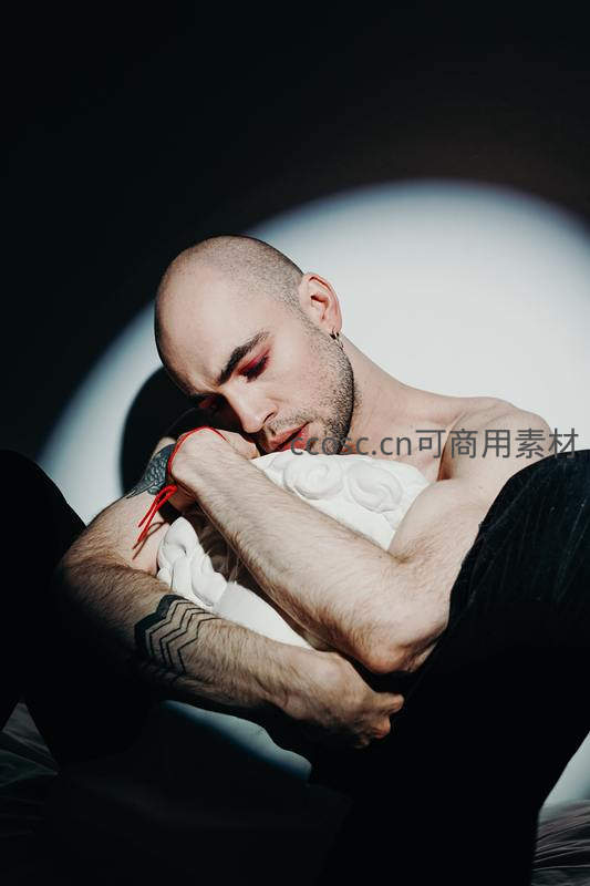 一名光头男子蜷缩在黑暗中,面部被一束圆形聚光灯照亮,手臂上的纹身与红色手绳细节清晰,整体氛围神秘而富有戏剧性,表现内心的脆弱与力量。