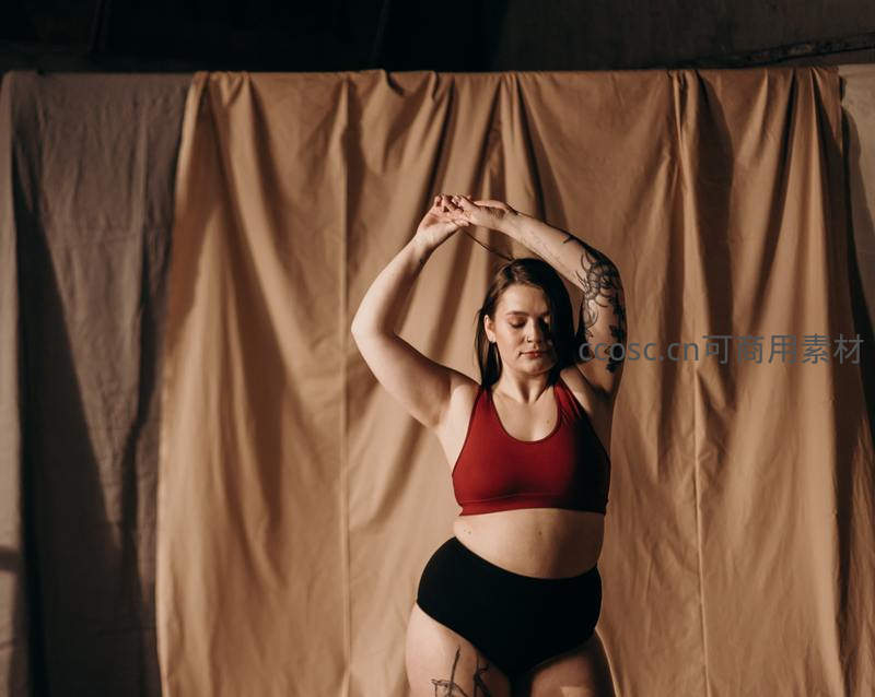 一位身穿红色运动背心和黑色短裤的女性,在棕色布幔背景前做伸展动作,手臂上的纹身清晰可见,展现出力量与柔美结合的姿态。