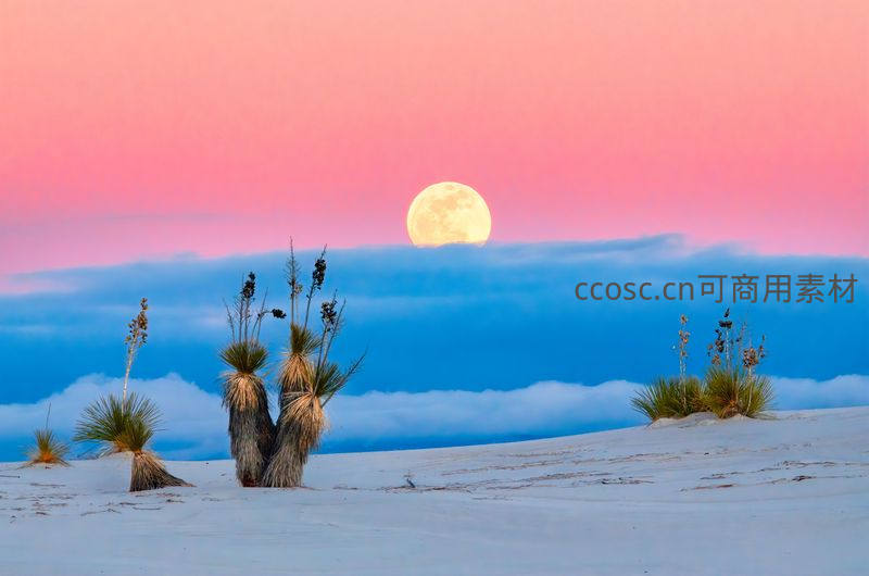粉红色天空下,一轮金黄满月从云海后探出,前景是沙丘上的丝兰植物,构成一幅色彩斑斓、充满异域风情的沙漠月夜图。