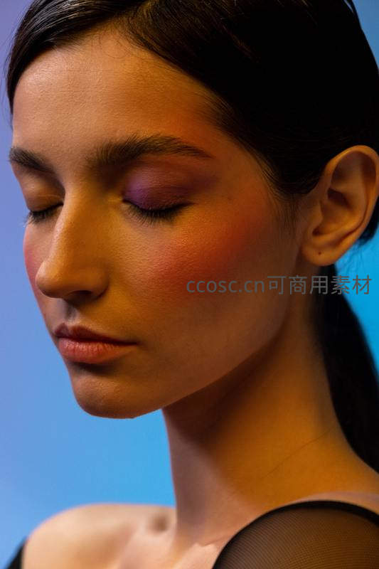 微距镜头捕捉女性闭目时的精致妆容,紫粉色调眼影与暖色腮红在冷暖光线下交融,展现现代美妆艺术的细腻美感。