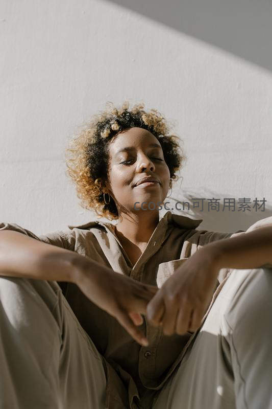 一位卷发女子倚靠在洁白墙壁旁,沐浴在斜射的阳光下,闭目微笑,享受片刻宁静,传递出悠闲自在的生活态度。