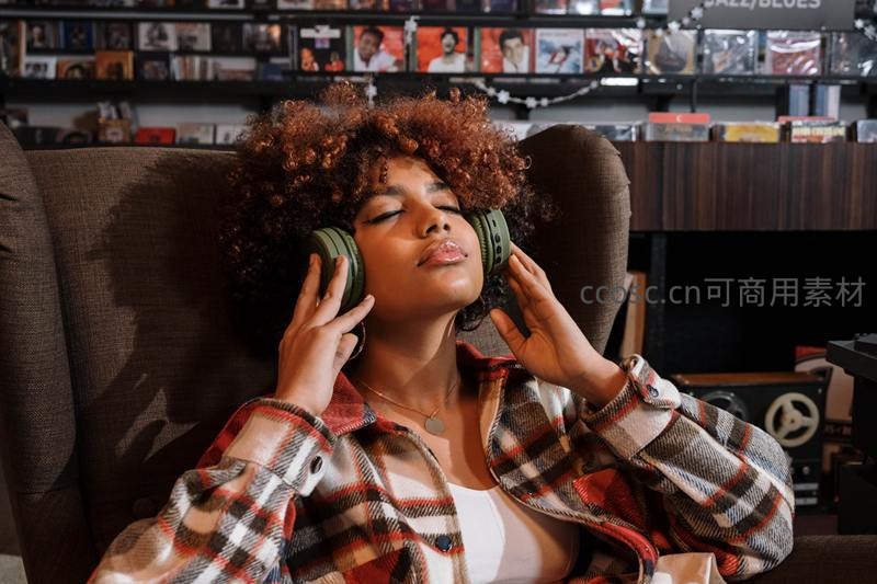 女子戴着耳机沉醉于音乐之中,身后是满墙的黑胶唱片,营造出复古而温馨的氛围,体现对音乐与生活的热爱。