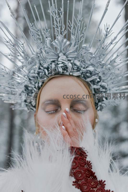 一位头戴华丽银色花冠、身披白色羽毛披肩的女子伫立雪林,闭目合掌如在祈祷,红色蕾丝衣袖与洁白背景形成强烈对比,尽显神圣与冷艳之美。