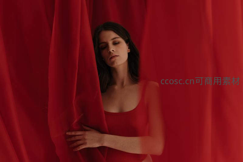 一位女子身着红色吊带,从鲜红的丝质帷幕缝隙中探出,眼神迷离,姿态慵懒,营造出一种神秘、浪漫且充满戏剧张力的视觉效果。