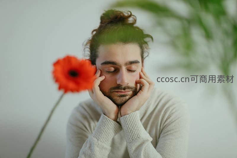 一位穿着米色毛衣的男子双手托腮闭目沉思,身旁一朵鲜艳的橙色花朵静静绽放,营造出宁静而富有诗意的氛围。