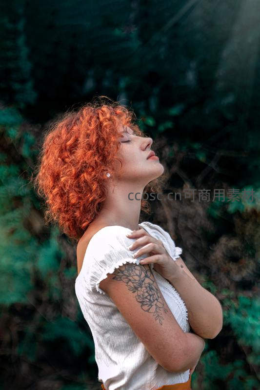 一位拥有蓬松红发的女子在幽深的森林中仰面朝天,阳光穿透树叶洒在她身上,手臂上的花卉纹身清晰可见,充满自然与艺术之美。
