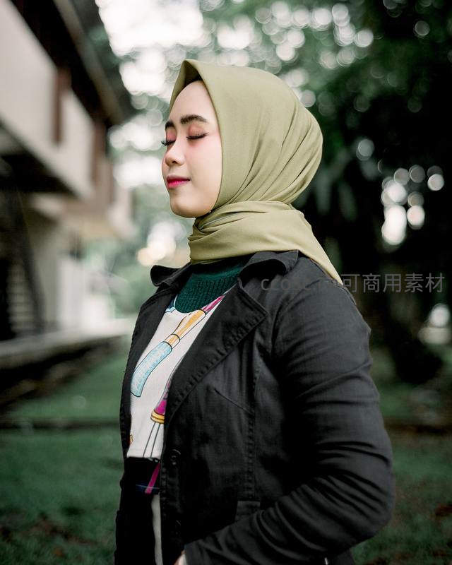 一位戴着橄榄绿色头巾的女子侧身站立于林荫小径,闭目微笑,享受着林间吹来的清新微风,神情恬静安详。