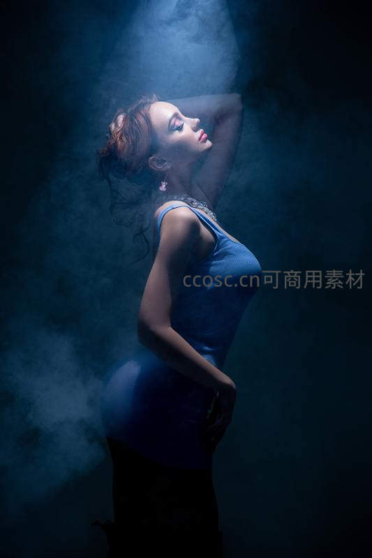 一位身着蓝色紧身上衣的女子在烟雾弥漫的暗色空间中侧身回眸,聚光灯勾勒其优美轮廓,营造神秘、性感且富有艺术感的视觉效果。