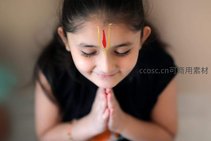额头绘彩的小女孩虔诚合十祈祷