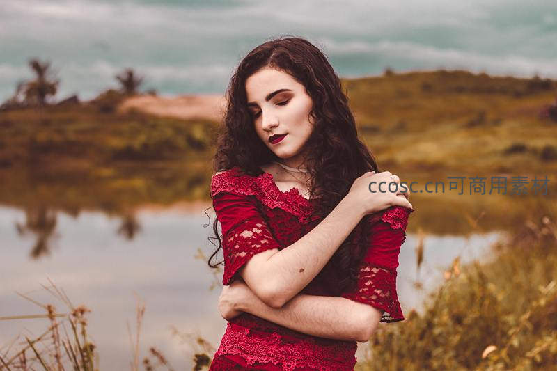 身着红色蕾丝长裙的女子伫立湖畔,双臂环抱,神情沉静,背景湖水与山丘构成诗意画卷,充满浪漫气息。