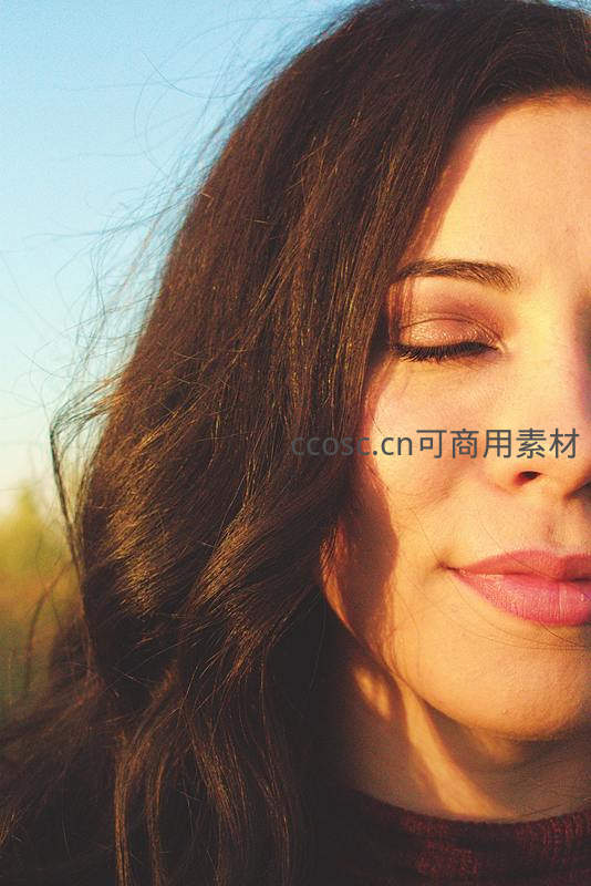 女子闭目微笑,金色阳光温柔地洒在她的脸颊上,长发微扬,享受着片刻的宁静与惬意时光。