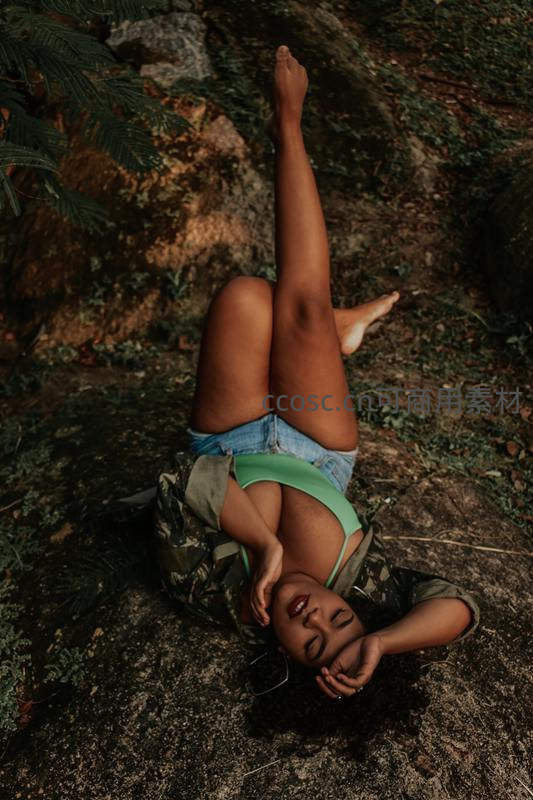 一名黑肤女子反躺在林间岩石上,双臂枕于头后,穿着绿色背心与牛仔短裤,眼神放松,享受大自然带来的自由与惬意。