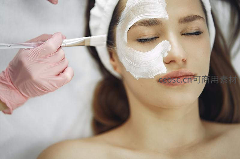 美容师正用刷子为闭目放松的顾客均匀涂抹白色面膜,场景专业而宁静,体现高端护肤体验与肌肤呵护过程。