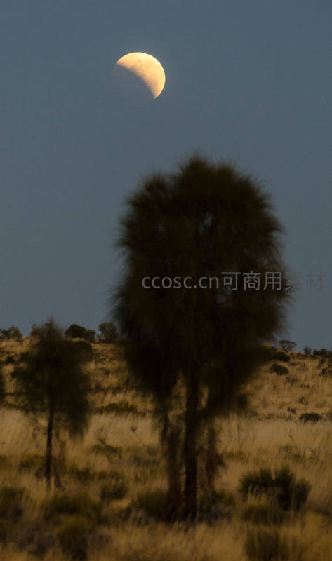 月牙高悬荒野,树影婆娑夜色