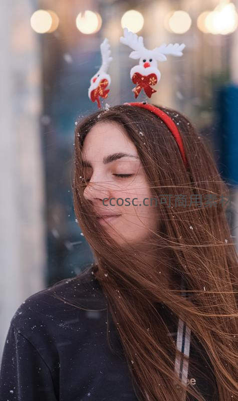 女孩头戴驯鹿造型红色发箍,长发随风轻扬,脸上带着恬静微笑,细雪飘落肩头,背景灯光朦胧,营造出浪漫温馨的节日氛围。