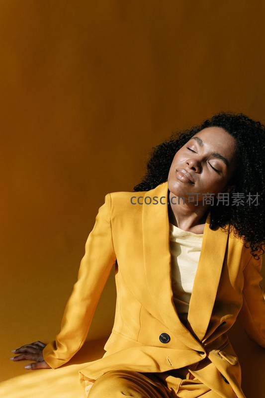 身穿亮黄色西装的女性闭目倚靠,神情安详,暖色调背景衬托出其优雅气质,体现现代都市女性的自信与从容。