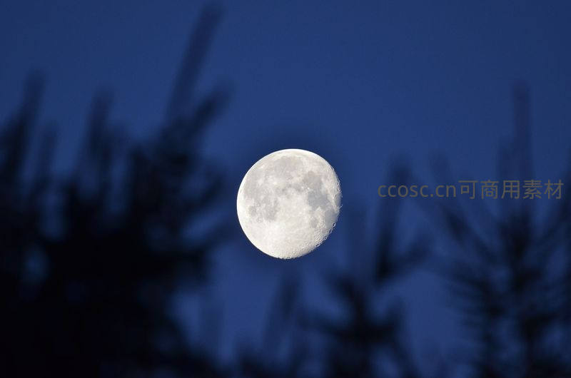 皎洁的满月在深蓝色夜幕中闪耀,前景松枝形成朦胧剪影,凸显月球表面纹理与宁静之美。