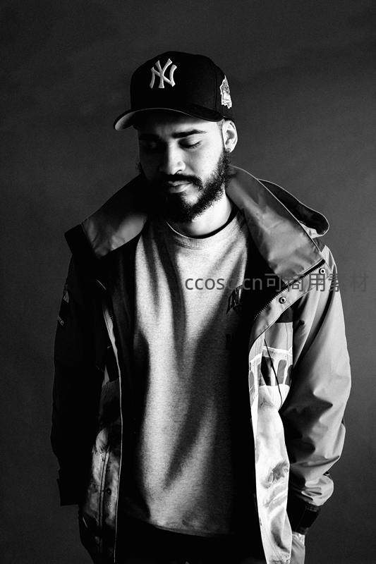 男子头戴棒球帽,身穿潮流夹克,闭目低首,黑白光影强化其沉静气质与街头时尚风格,充满故事感。