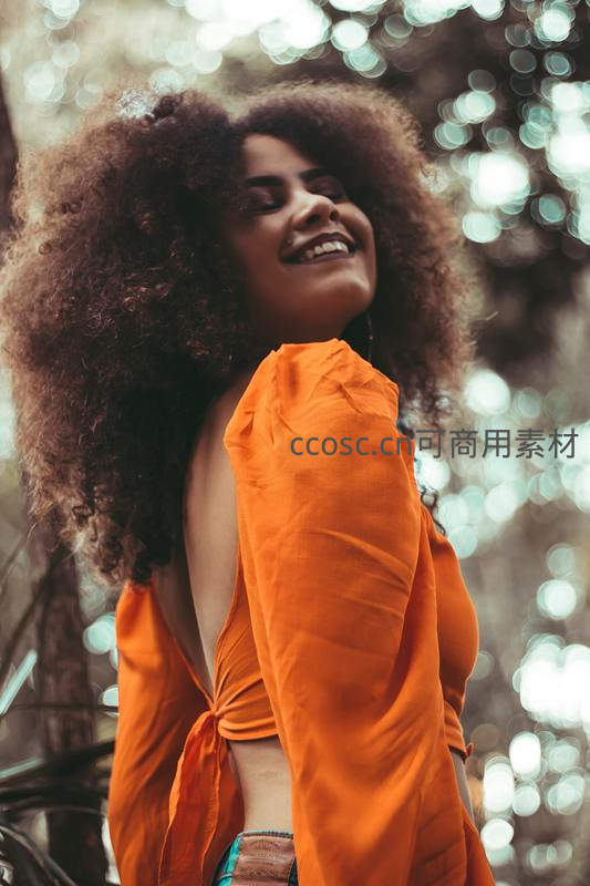 森林中橙衣卷发女子微笑回眸,阳光斑驳