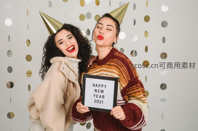 两位年轻女性戴着金色派对帽,在闪亮背景前开心庆祝新年,手持写有“HAPPY NEW YEAR 2021”的灯箱,洋溢着节日的喜悦与亲密友谊。
