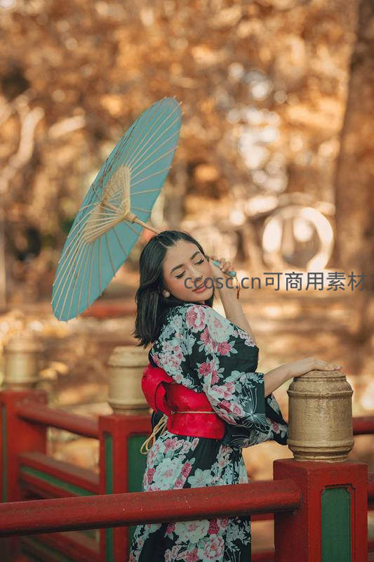 身着花色和服的女子手持青色油纸伞,倚靠在红漆木栏旁,背景是金黄落叶的庭院,尽显东方古典韵味与静谧之美。