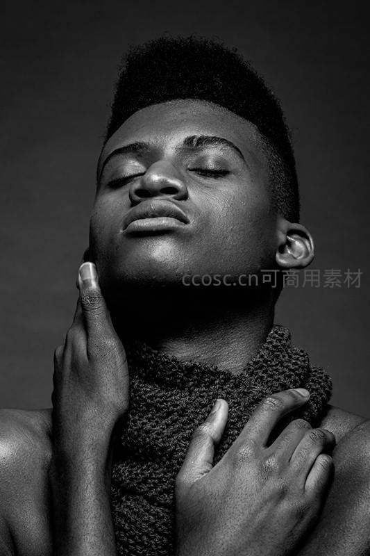 黑白色调下,一位年轻男子闭目仰头,手轻抚颈部与锁骨,针织围巾增添温暖质感,强烈的明暗对比突显其深邃的内心世界。