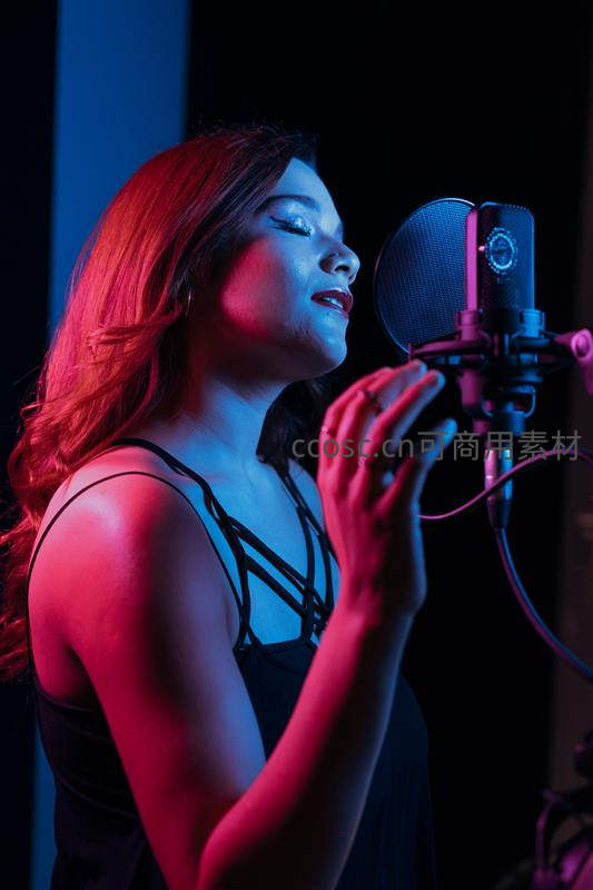 女性歌手在专业录音棚内闭目吟唱,红蓝冷暖光交织洒落肩头,营造梦幻舞台感,专注神情与专业设备共同呈现音乐创作的沉浸时刻。