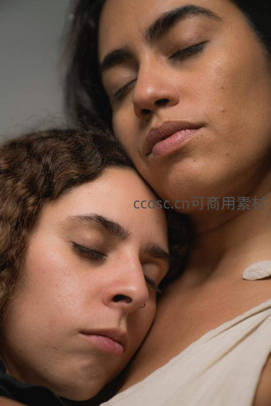 两位女性亲密相拥,一人将头轻轻靠在另一人肩上,双眼微闭,神情安详,传递出深厚的情感与宁静的陪伴。