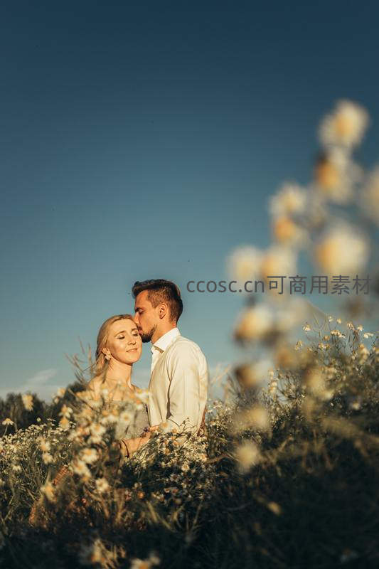 金色夕阳洒落在花丛中,情侣相拥而立,男子轻吻女子脸颊,背景蓝天如洗,前景花朵虚化,意境唯美。