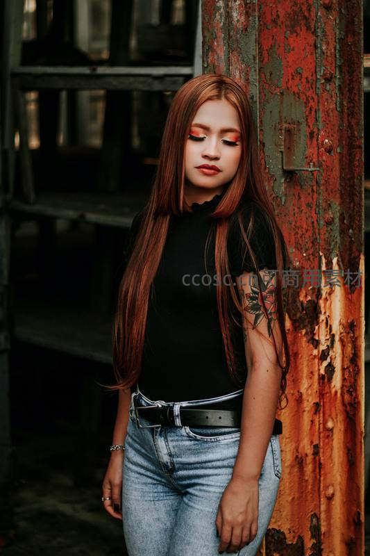 长发染成红色的年轻女子身穿黑色上衣和浅色牛仔裤,手臂有花卉纹身,倚靠在斑驳锈蚀的金属柱旁,眼神略带忧郁地望向镜头。