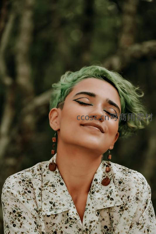 一位染着醒目绿色短发的女性闭目微笑,身穿碎花衬衫,佩戴木质耳环,在模糊的树林背景下享受片刻宁静与自然的拥抱。