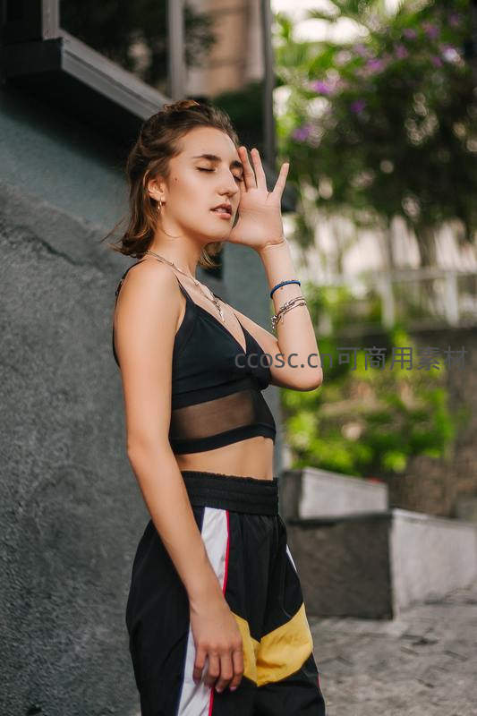 穿着黑色运动背心与拼色长裤的女孩站在街角,用手轻遮阳光,闭目享受微风拂面,姿态随性自然,充满都市青春气息。