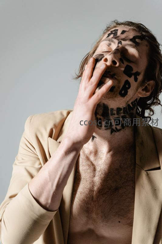 男子脸上和颈部布满黑色字母涂鸦,身穿米色西装外套却敞怀露胸,手轻触面颊,呈现强烈的视觉冲击与艺术表达。