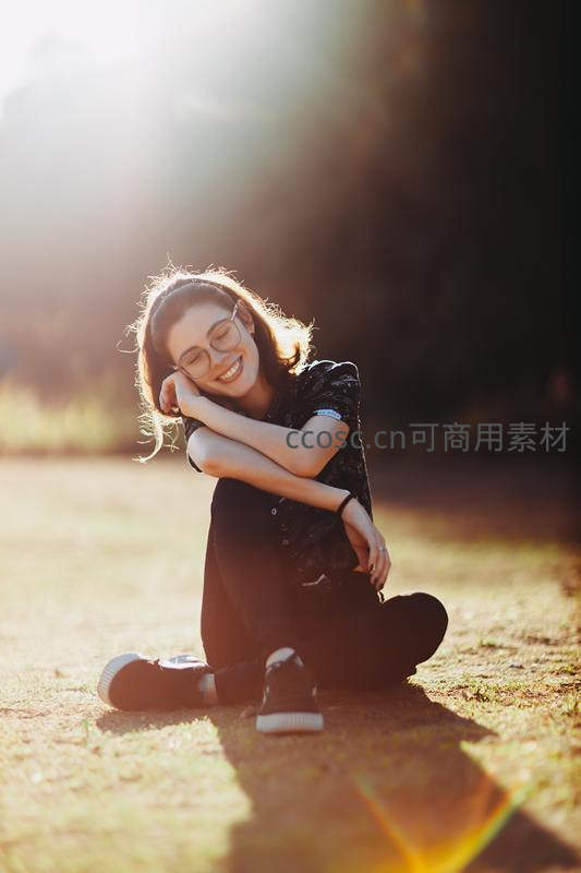 女孩坐在夕阳下的草地上,戴着眼镜绽放灿烂笑容,逆光勾勒出温暖轮廓,充满青春活力与治愈感。